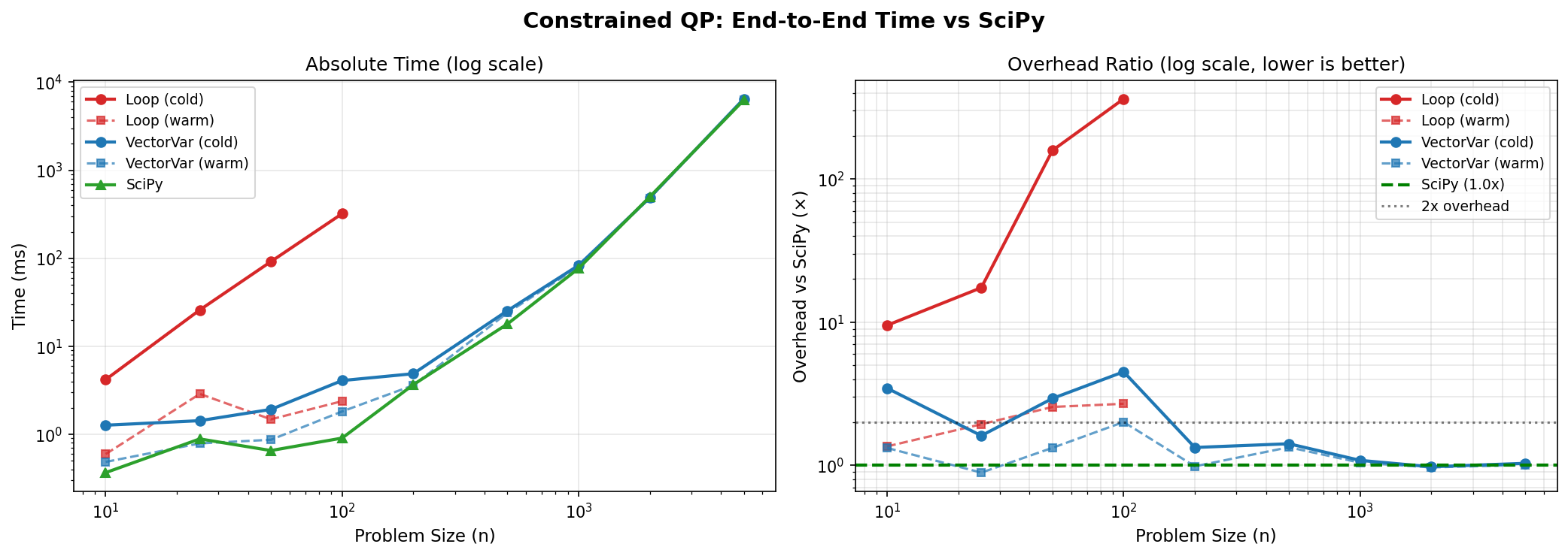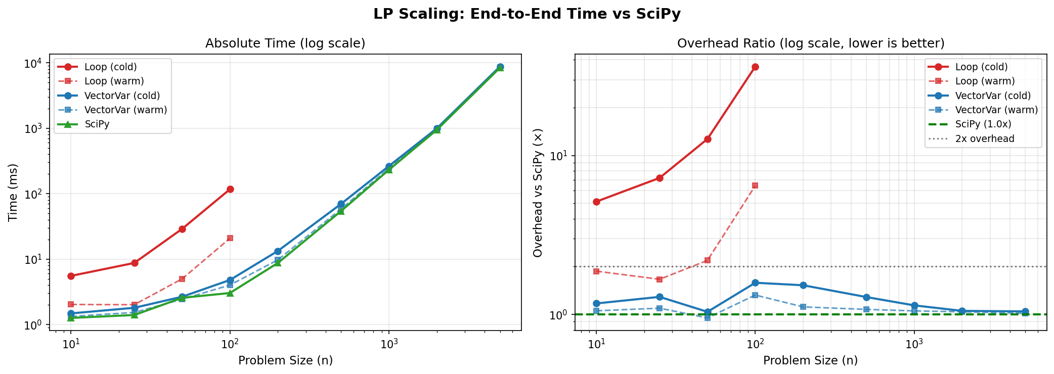 VectorVariable achieves parity or better than raw SciPy for warm solves at all scales. Cold solve overhead is ~2x due to one-time compilation.