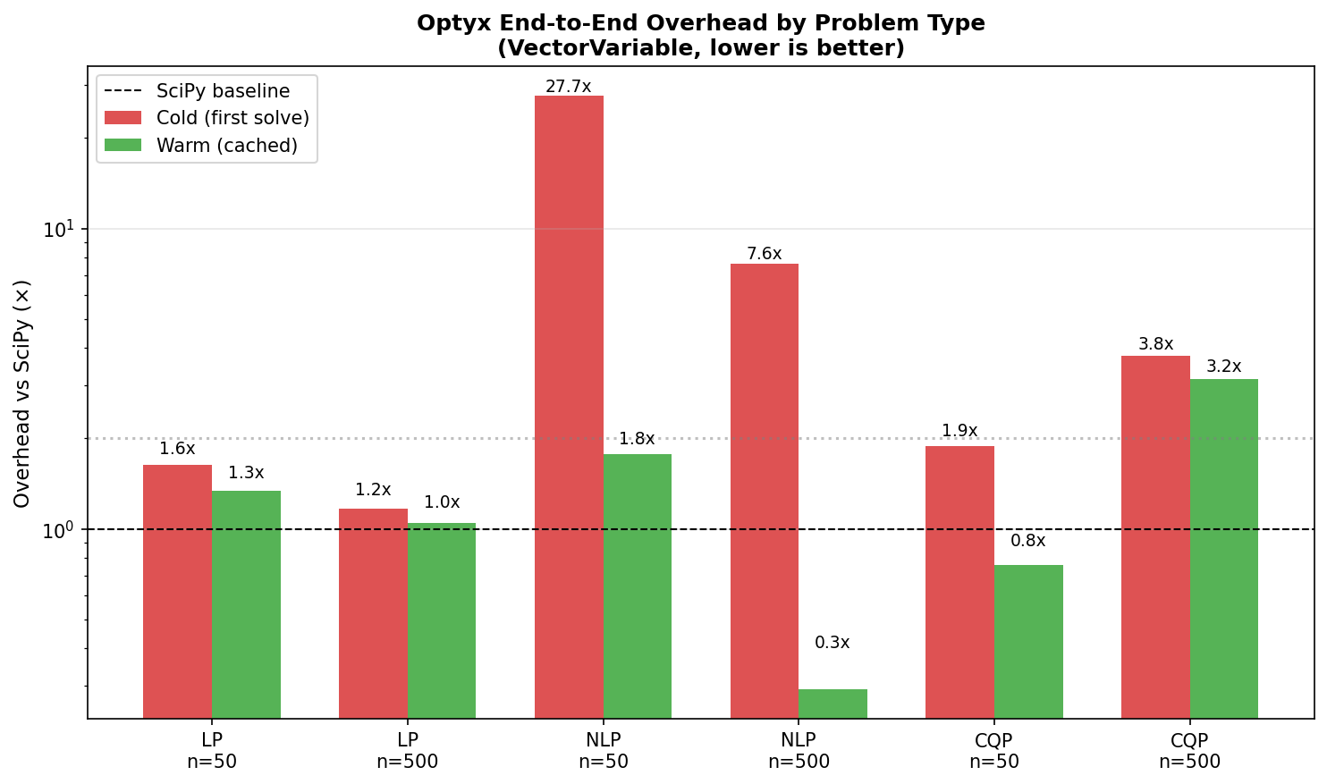 Pattern: Cold overhead includes one-time compilation. Warm overhead is at or below 1.5x for all problem types - Optyx matches or beats raw SciPy on repeated solves.