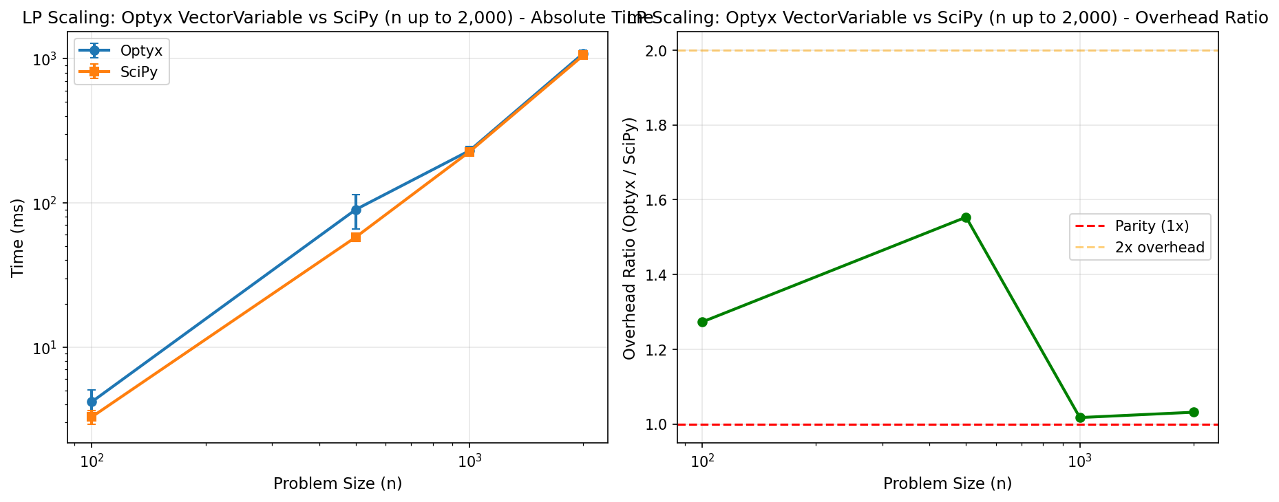 | Medium LP (20 vars) | 1.3ms | 1.5ms | 0.85x | Optyx faster |